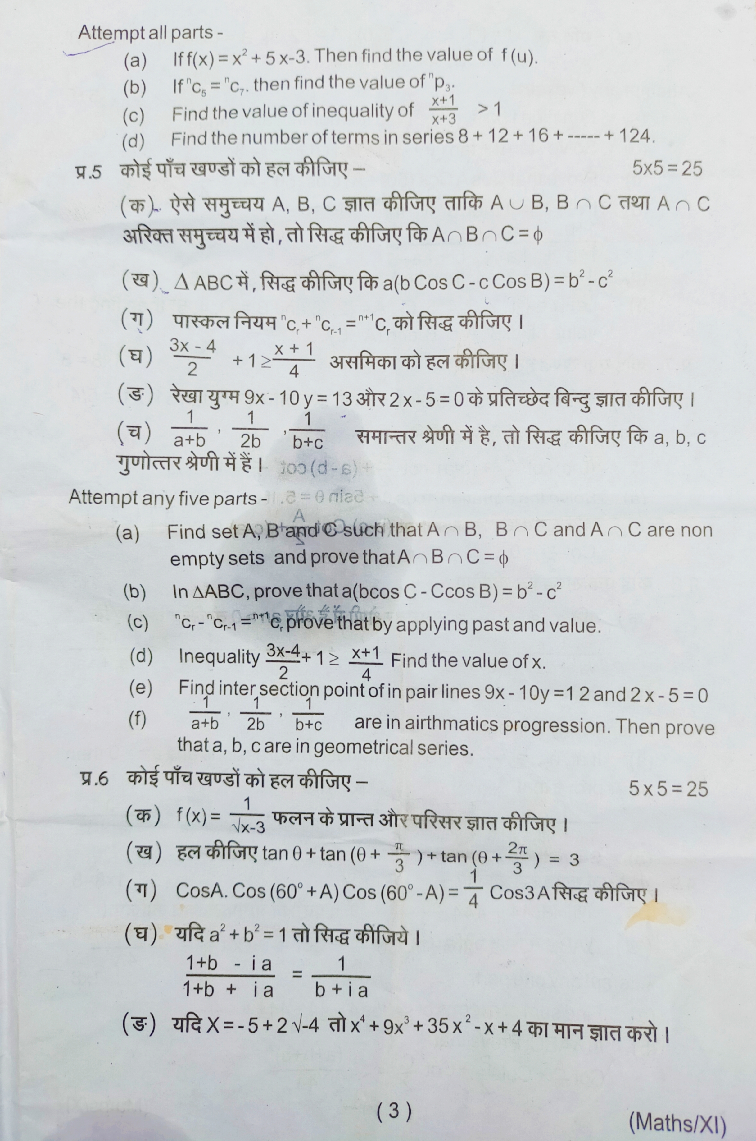 कक्षा 11वी गणित अर्द्ध वार्षिक परीक्षा पेपर यूपी बोर्ड 2022-23